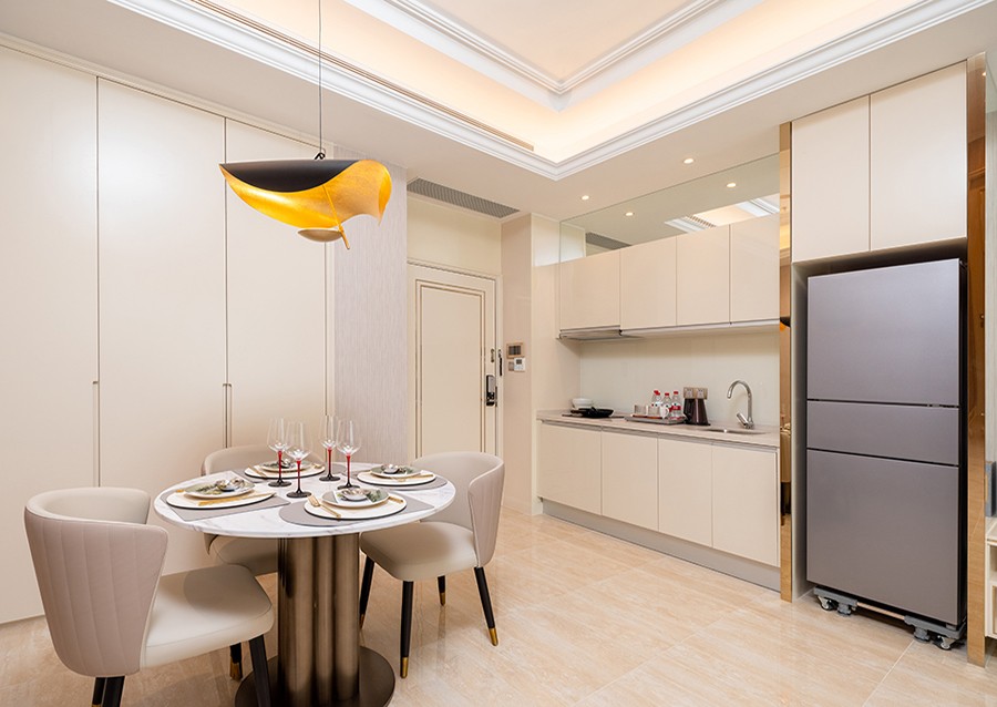 房内可欣赏旖旎太湖湖景或苏州湾璀璨城市夜景。全屋配备设施齐全的厨房及洗烘干一体机,为您的生活带来便捷舒适,让您的目的地成为您的另一个“家”。